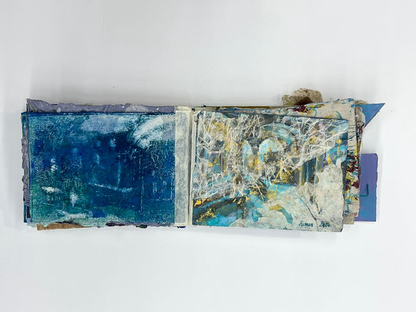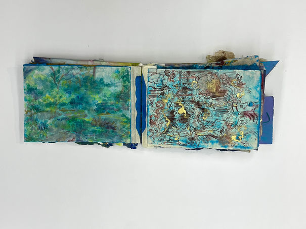 Watercolor, gouache, ink, gold leaves, foraged flowers and leaves, intaglio ink, pom pom on handmade and recycled paper